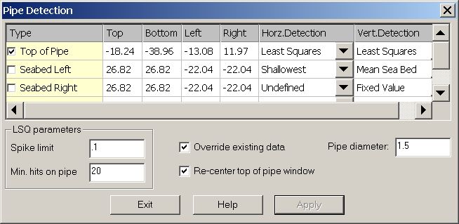 The first two parameters can be defined by the user in the pipe detection dialog, the other parameters can be changed in the registry.