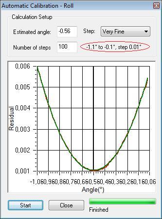 Click on Start. An estimated angle is calculated. If the estimated angle is not in the search area, repeat with the same step size until the estimated angle settles down.