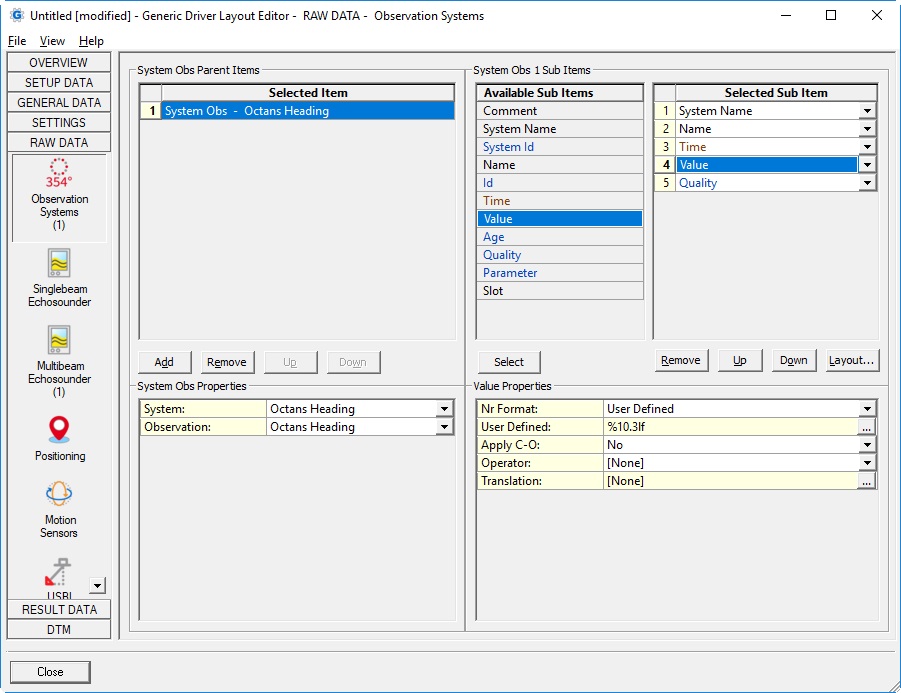| System: | List with all available 'observation' systems that exist in the currently selected Qinsy database. (See General Layout Information about loading a Qinsy database.) The following 'observation' systems are supported: