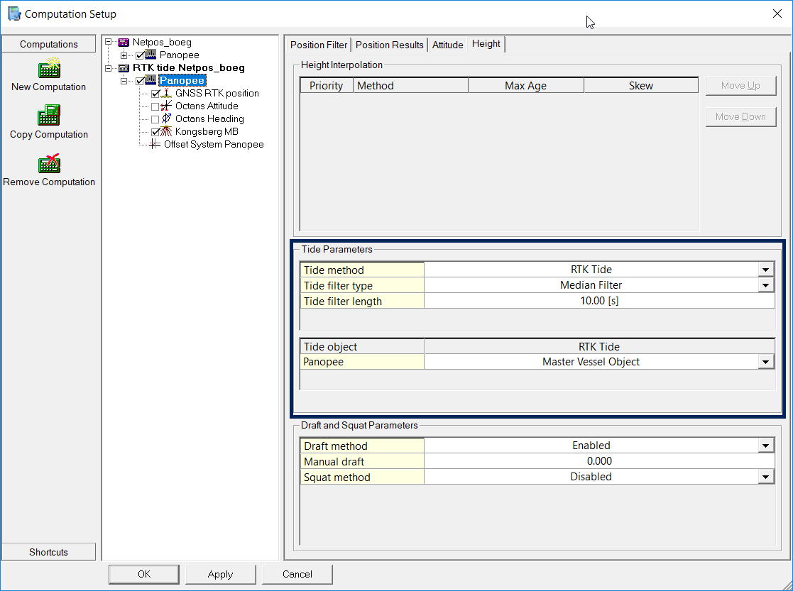 This option has been added to the Computation Setup under the Height tab. Two or more computations are needed whereby one has unreliable heights only and another has at least one accurate height. In order to actually use the RTK Tide for heighting , the 'unreliable height' computation must have top-priority and the 'accurate height' computation must be further down the priority list of computations.