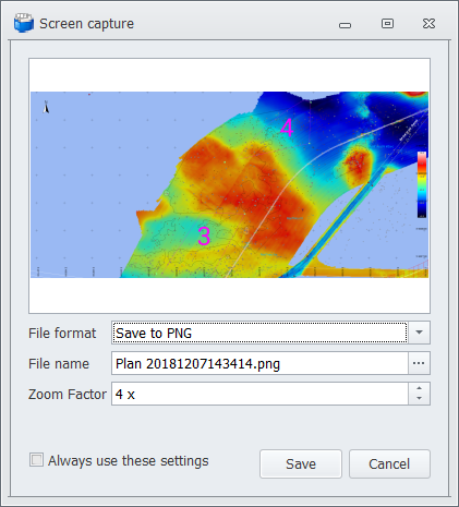 Also, Ctrl-Shift+P can be used and a dialog is opened in which the file format can be selected, a file name, a folder and the zoom factor.