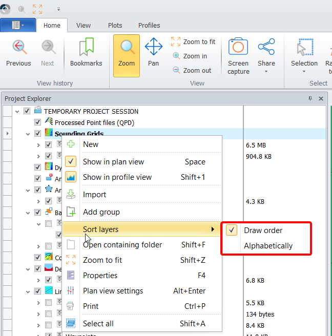 When you have enabled the option, all layers in the Sounding Grid and Dynamic Surfaces will be sorted alphabetically. The setting stays active until disabled.