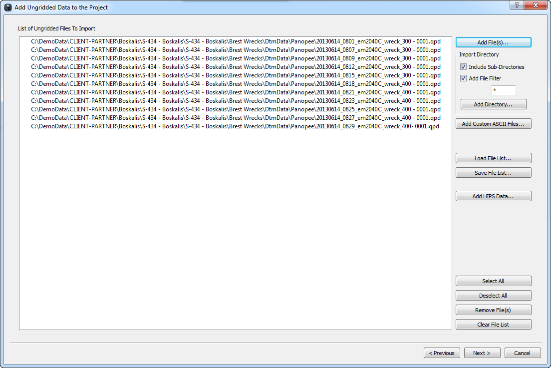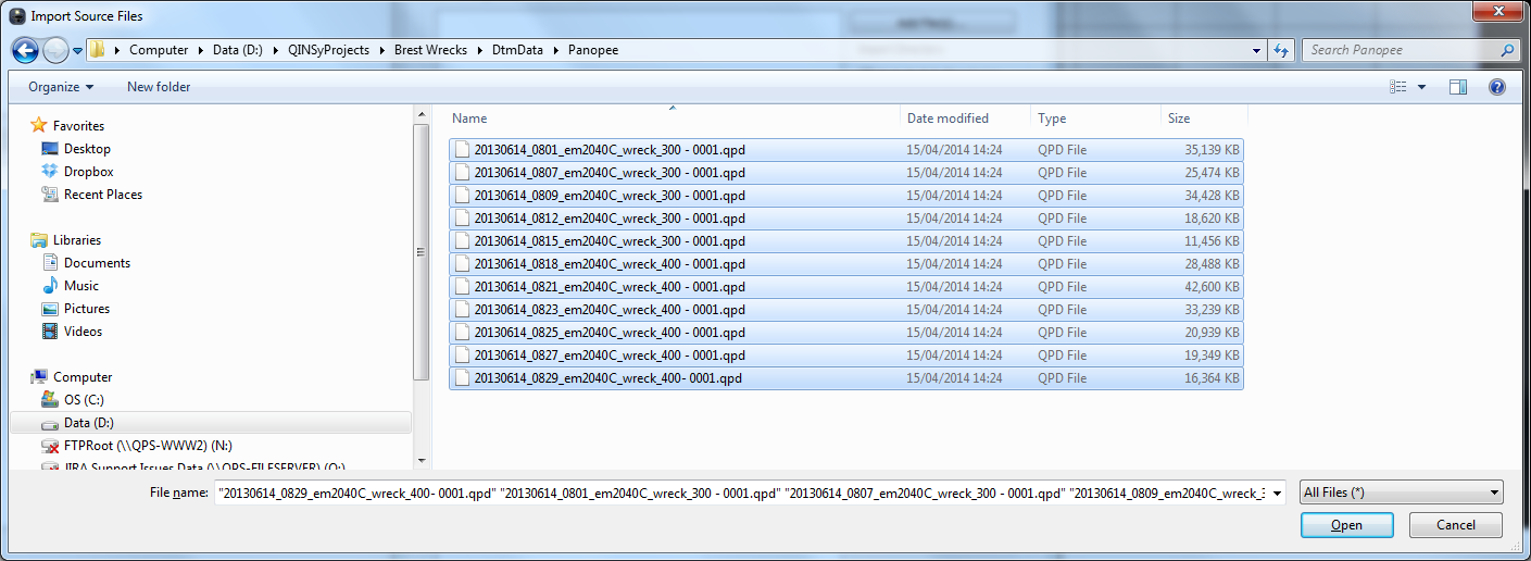 From the File menu, select Add Source Data; click the radio button next to Ungridded Data. Click Add File(s), then navigate to the Qinsy project folder, DtmData folder and select the QPD files. Click Open