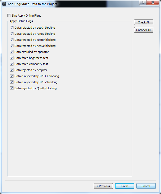 If you would like to use the flags that were set online, check them on. When Online Flags are applied, all soundings flagged in Qinsy will be marked as rejected and you will be able to see the soundings in the 3D Editor if you turn on the Rejected Soundings. If you don't want to apply the online flagging, then "Skip Apply Online Flags". Click Finish.