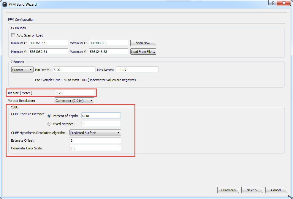 In case you want to apply other mapping, then you would have to change the mapping settings. Please contact Support should you have questions regarding the mapping settings . Click Next.Set the Bin Size for your data. If you chose to use CUBE, you will also set the CUBE Capture Distance, CUBE Hypothesis Resolution Algorithm, Estimate Offset, and Horizontal Error Scale on this page of the wizard (if you did not check on the "Use Auto-Processing CUBE" box, the CUBE options will be greyed out and you will only have to set the Bin Size).