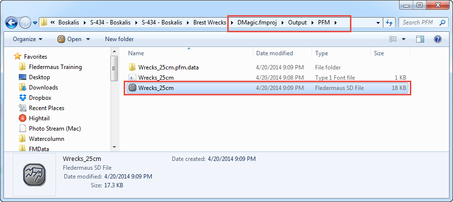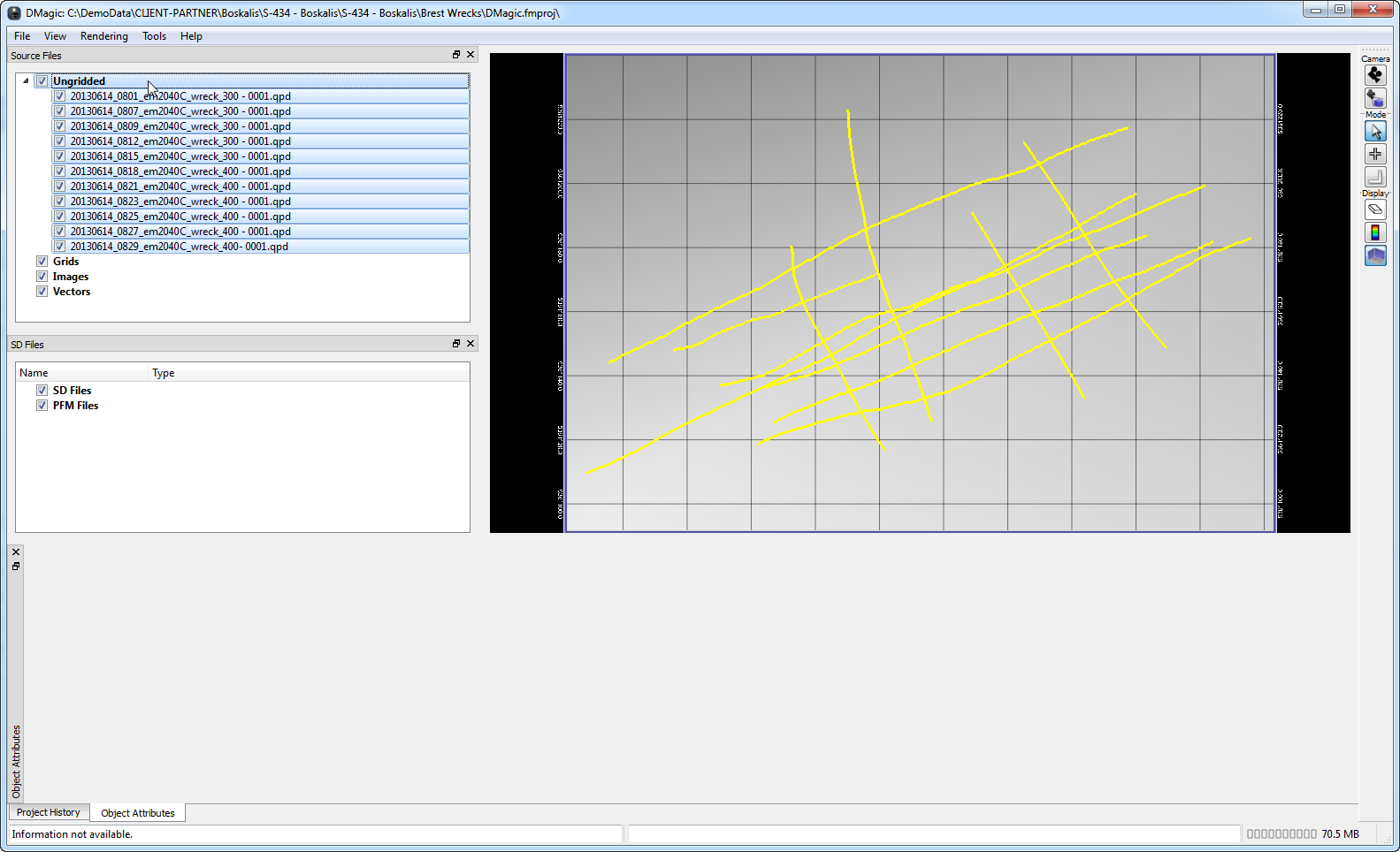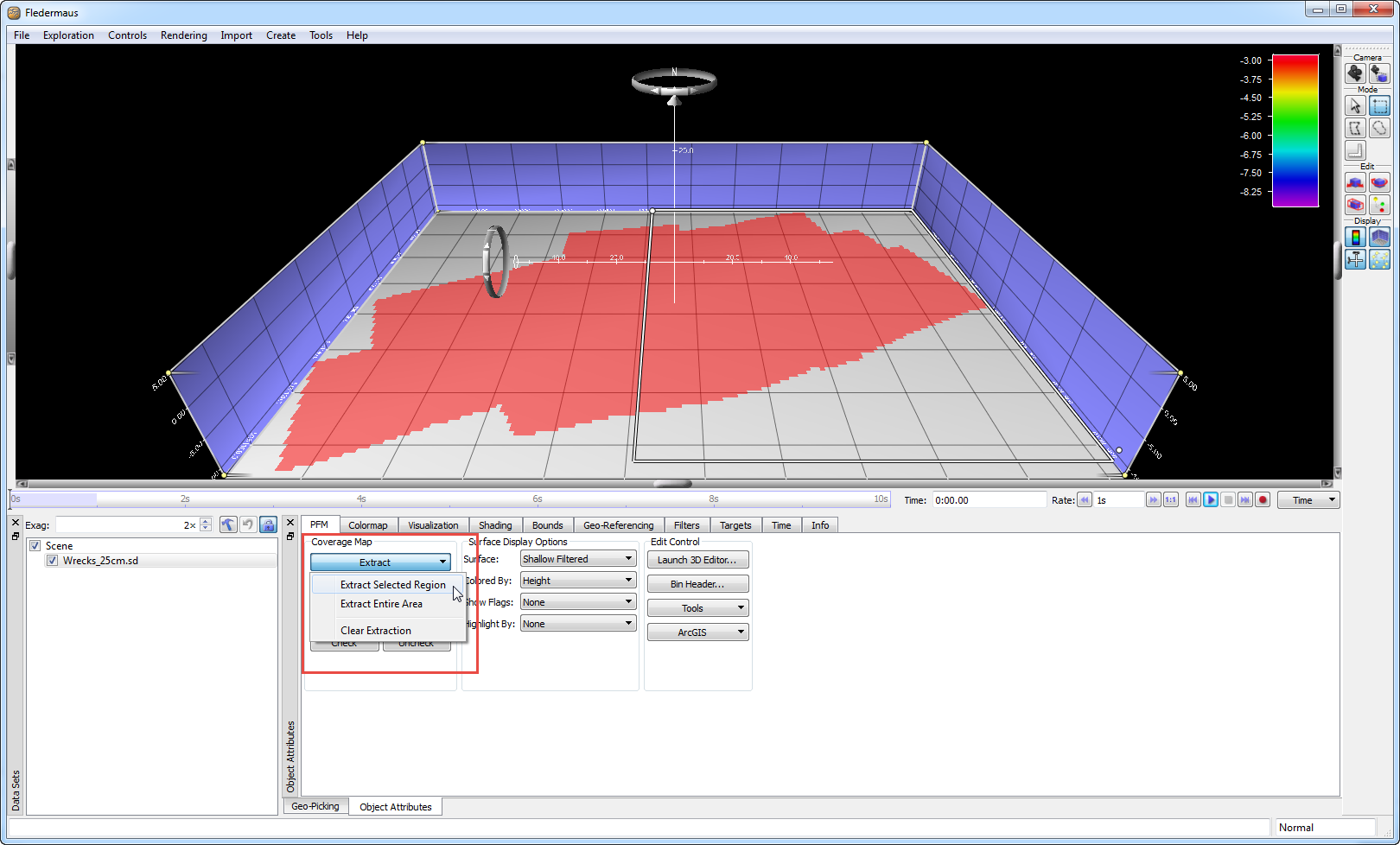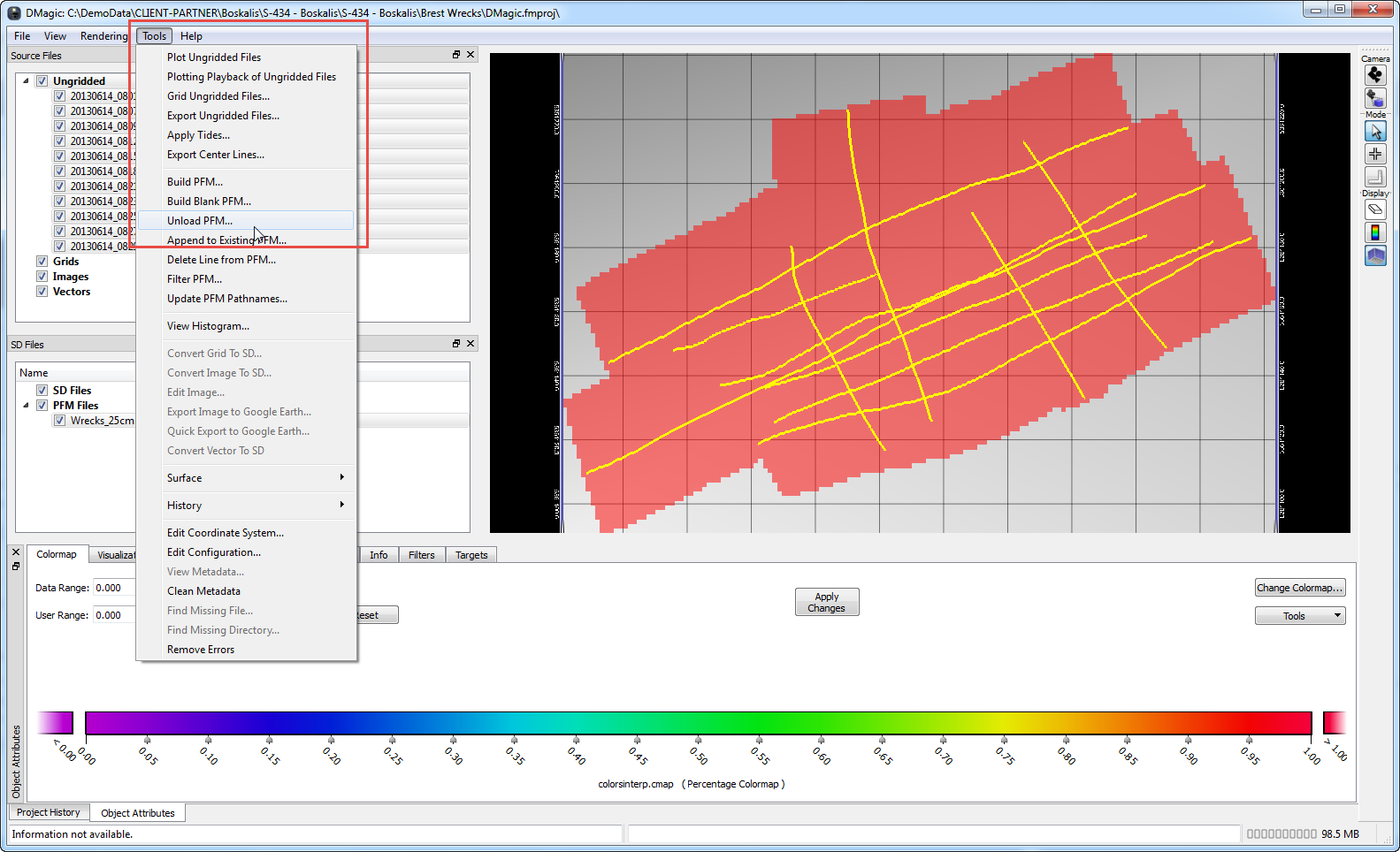 Alternatively, Open Fledermaus by clicking on the Fledermaus icon, go to File > Open data Object/Scene, and naviagate to and select your PFM SD. The PFM file will be in your DMagic project folder under Output > PFM