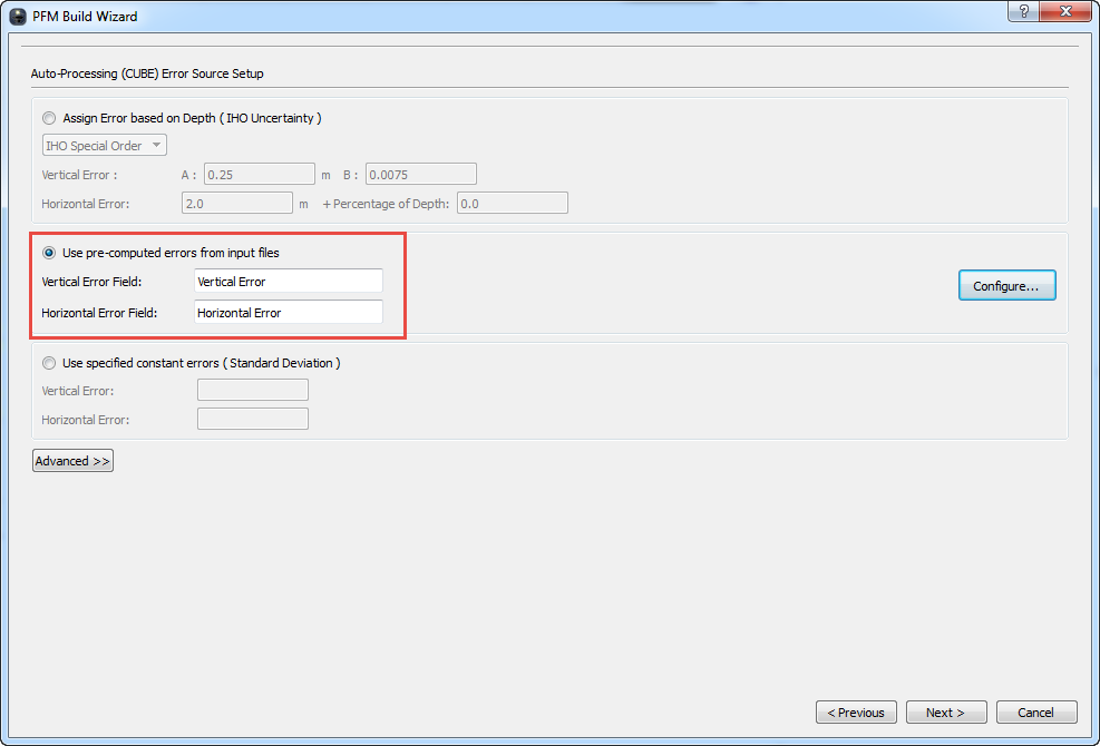 The error values will be taken from the "Vertical Error" and " Horizontal Error" fields in the QPD (if this needs to be changed for any reason, click Configure to view the available files and choose the error source fields). Note that if you did not choose to "Use Auto-Processing CUBE", you will not see this page of the wizard.