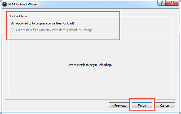 The only option for PFM files generated from QPDs is to Apply Edits to Original Source Files (Unload). Click Finish to start the Unload process.