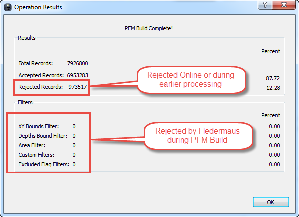 After the PFM Build completes, you will see the Operation Results screen. Note that any Rejected Records are points that were marked as rejected by the online filters. Review, then click OK to clos