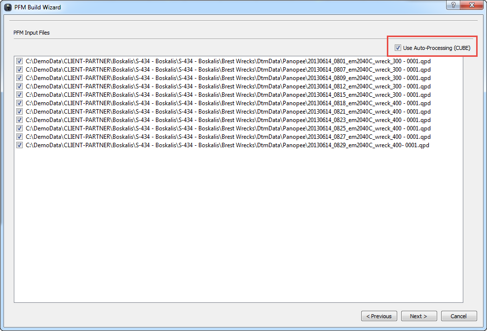 The selected files will be listed. If you would like to build a CUBE surface, check the "Use Auto-Processing CUBE" box. Click Next