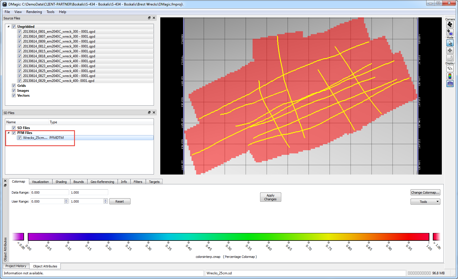 The PFM will be listed in the SD Files Area under PFM Files. The PFM Coverage map will be visible in the visualization area
