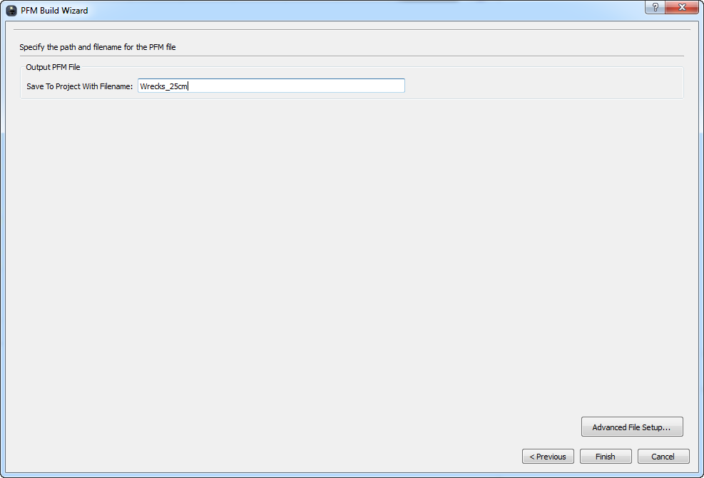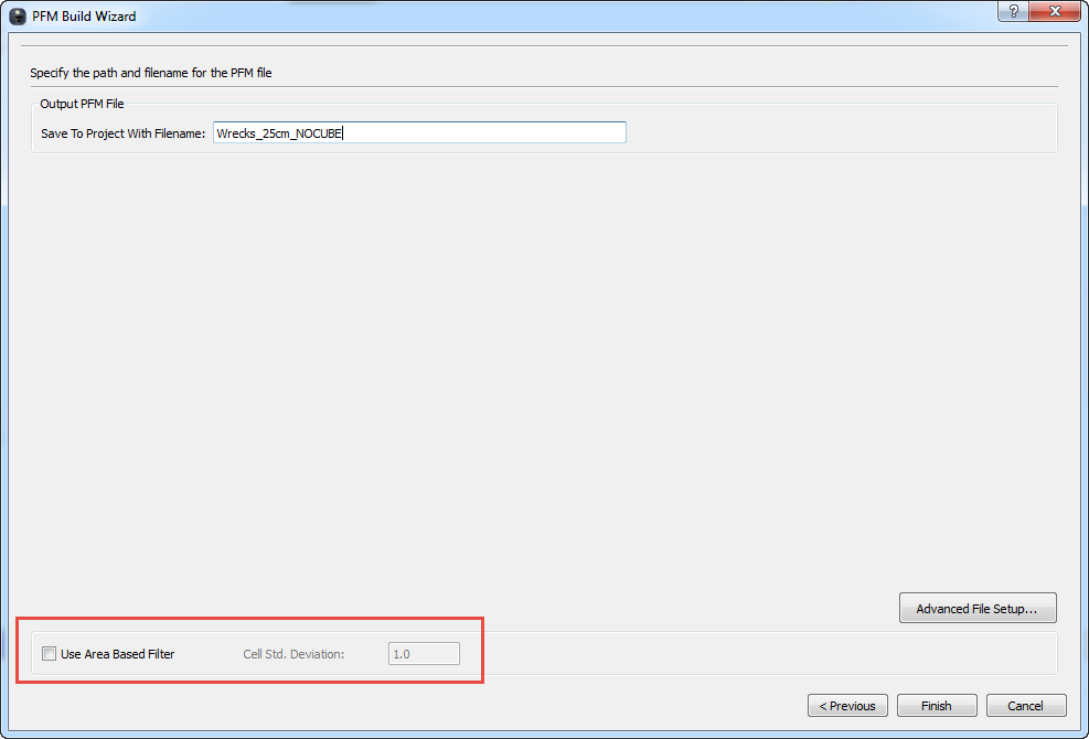 Name your PFM. If you did not use CUBE, you will have the option to check on the Area Based Filter. Click Finish to start the PFM build process