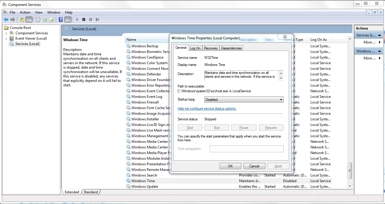 When working in a workgroup the Windows time service is by default disabled.