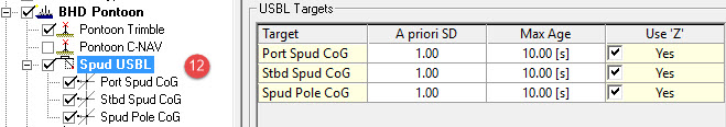 If the dredge tool is positioned three dimensionally by the Pseudo-USBL, enable the use of the Z Observation. If there is a depth sensor providing dredge tool depth, deselect the Z Observation from the Pseudo-USBL observation.