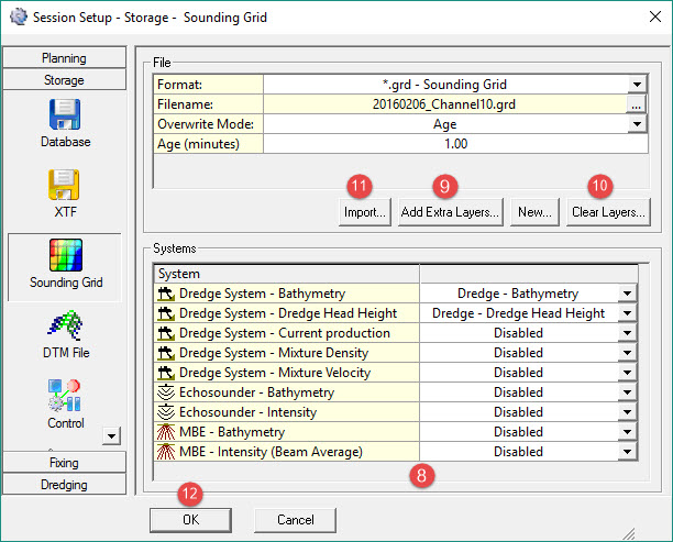 - Controller - Settings - Session Setup - Storage - Sounding Grid: This is the best option for dredging. It uses the newer 'Creating a New Sounding Grid' program. At startup a number of predefined layers, based on the content of the template database, are available for activation.