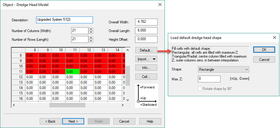 In essence the dredge head is defined as a matrix of pseudo-singlebeam echosounders, one for each cell of the matrix. Therefore you must enter the number of rows and columns, and the actual overall width and length of the head. Use the button to generate the number of cells that fit the entered dimensions. Define the maximum Z, which is the distance from the reference node of the head to the cells representing the suction plane.
