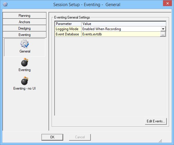 | Event Database | When fired the events can be stored in an event database (*.evtdb). This file is only used for visibility of the events in the displays. The events themselves are stored in the normal QINSy database. Enter a name and location for this file using the browse button. |