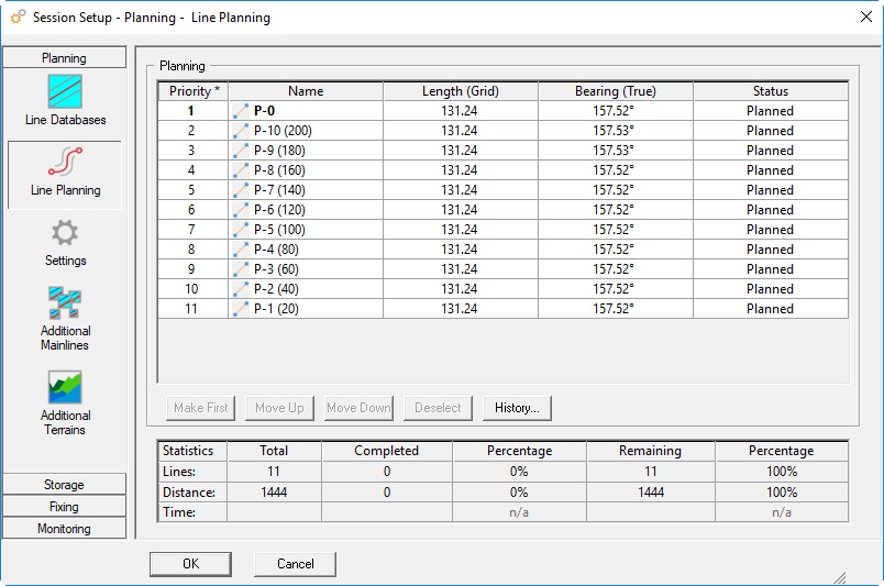 Cumulative length of all Total Lines (see description above). Notice that the length for each individual line can be seen in the Controller's Session Setup Line Planning dialog. It depends on the current global range reference setting whether the distance is calculated on grid, or on the speroid (true).
