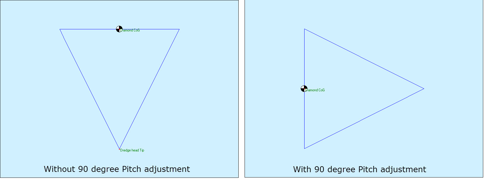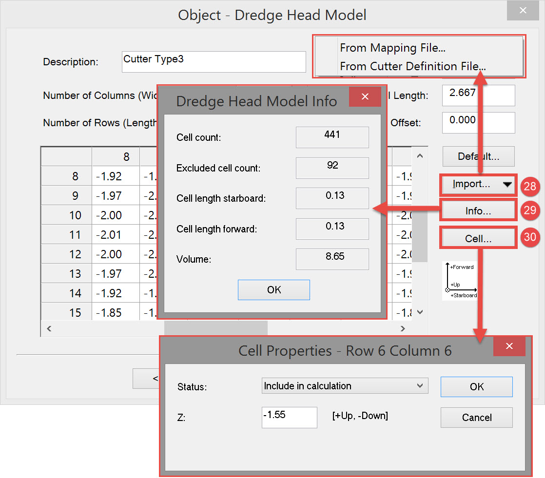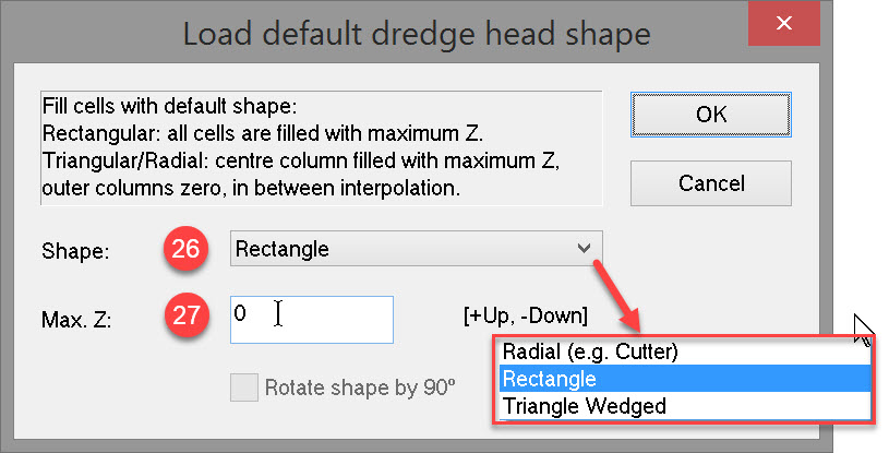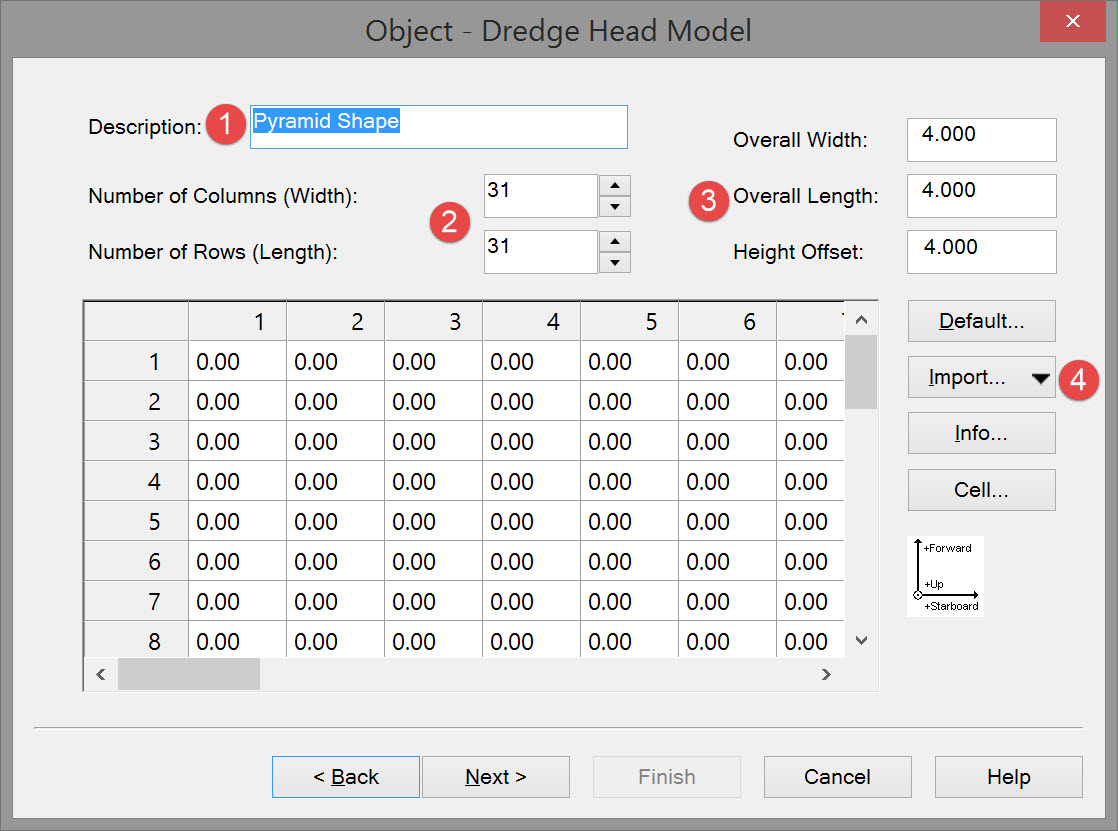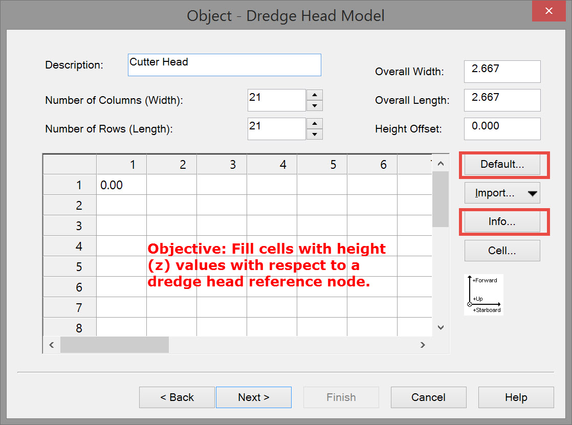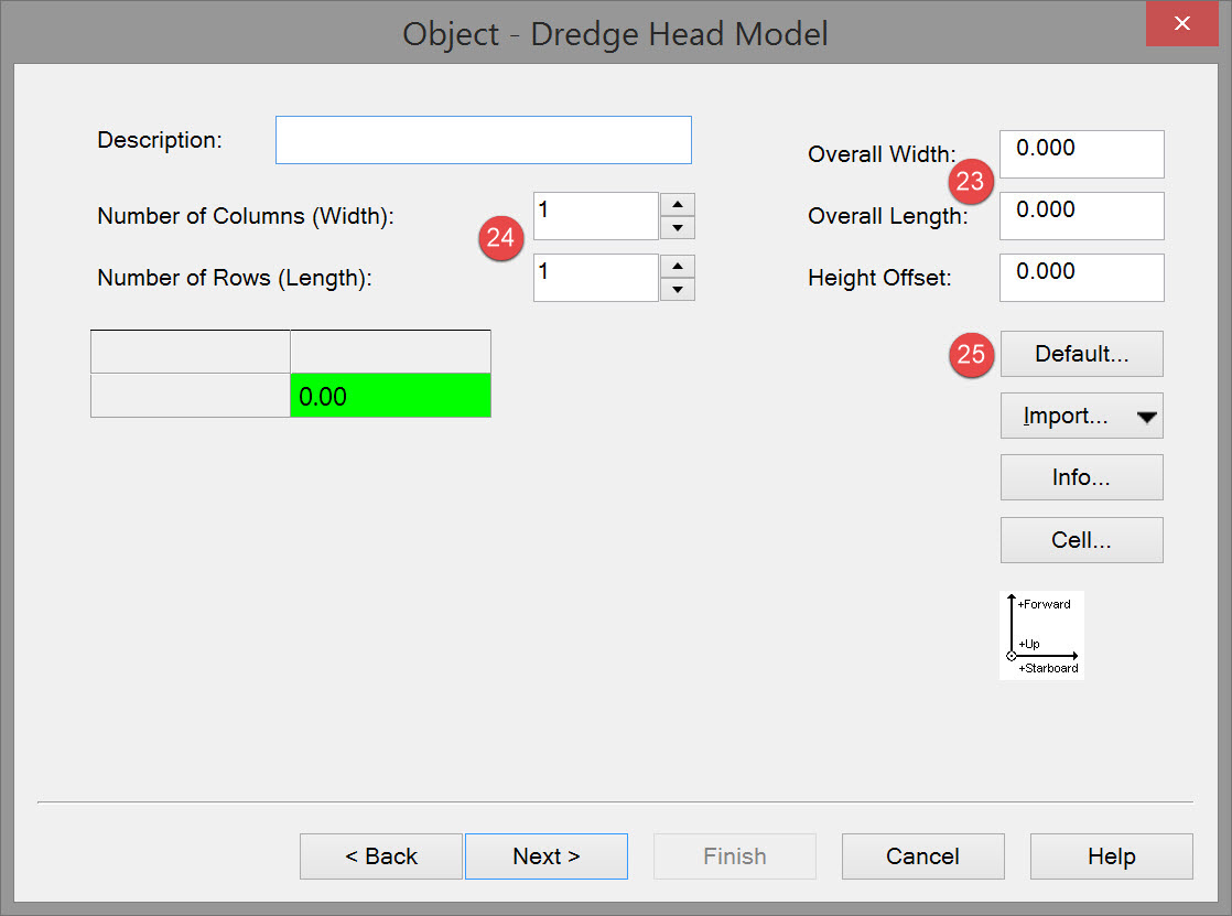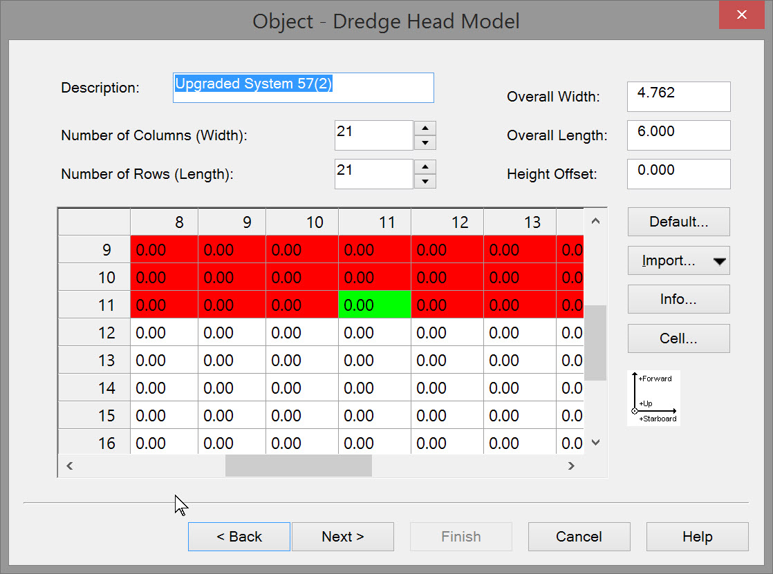 However the most important factor is the cell size of the sounding grid you wish to update. If the size is 0.5 by 0.5 units then choose a dredge head model cell size of at least 2 times smaller. This will guarantee that every grid cell is hit by the model’s sounding with every possible dredger heading.