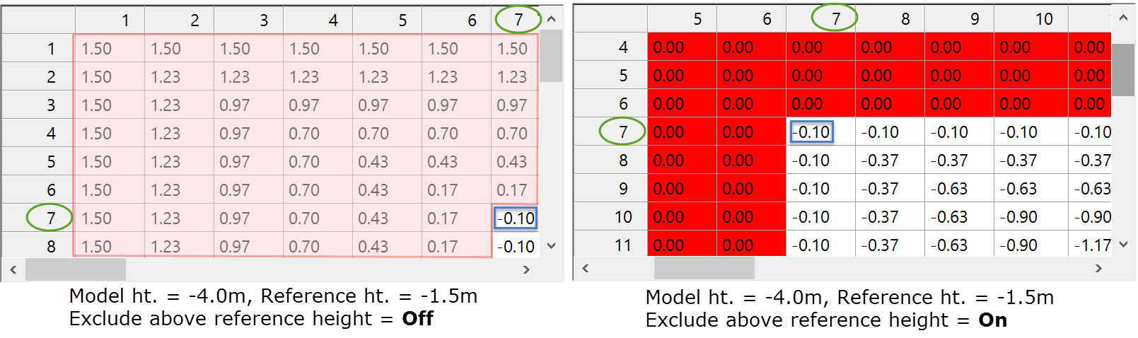 In our example the height is -4.00m. Setting the Reference Height to -1.00m yields this result for the height at the reference point of the model: