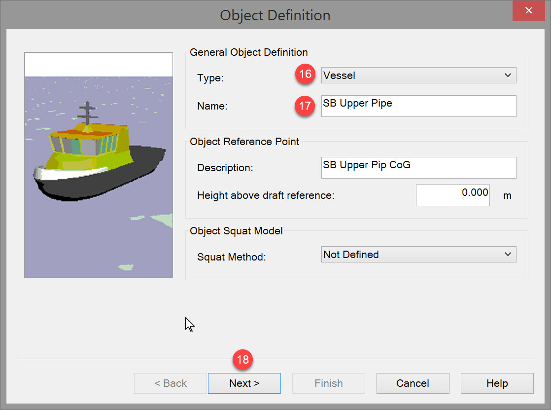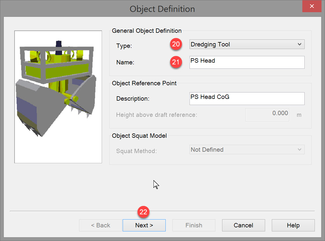 Unlike the previous objects all defined as 'vessels', a dredge head is of type 'Dredging Tool'.