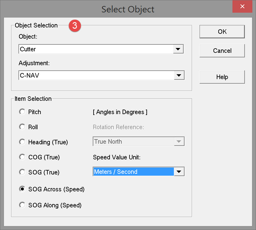 | Pitch, Roll, Heading (True) COG (True), SOG (True) SOG Across (Speed) SOG Along (Speed) | Select which item is to be displayed for this object. |