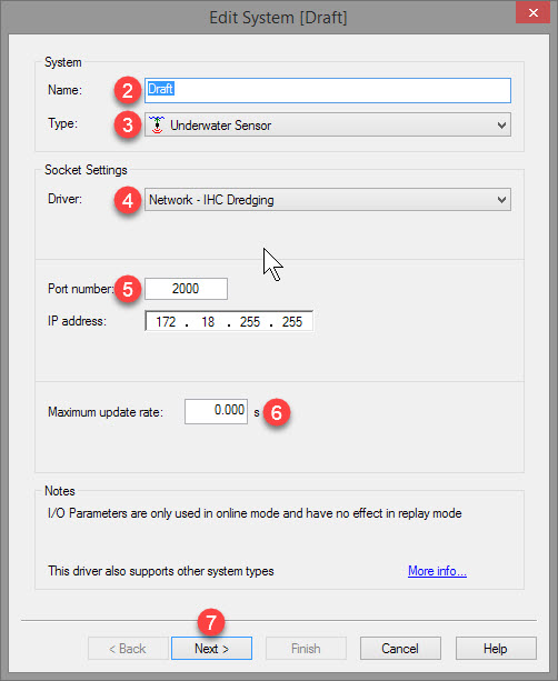 | Maximum update rate | Enter a value to determine how often data will be decoded by the interface driver. Some equipment is capable of outputting data at high output rates, but it may not be necessary to use each update. A sensor system may for example output values hundreds of times per second, where five times per second is sufficient. In this case, enter a value of 0.20s. Any data not decoded by the driver is lost and cannot be recovered later. |