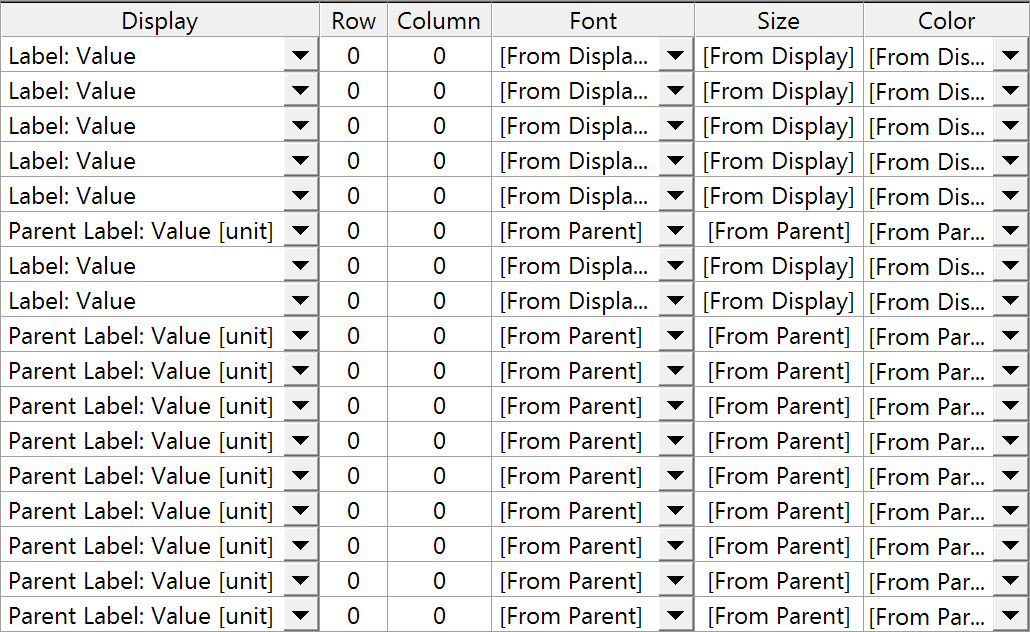 The default display font. The list depends on the available/installed fonts on the computer This setting can also be changed in the display itself, under Edit, Display Defaults... It is this font that will be used for a layout item when that item has font property [From Display]