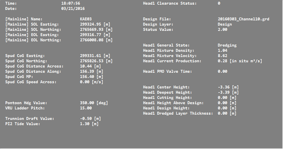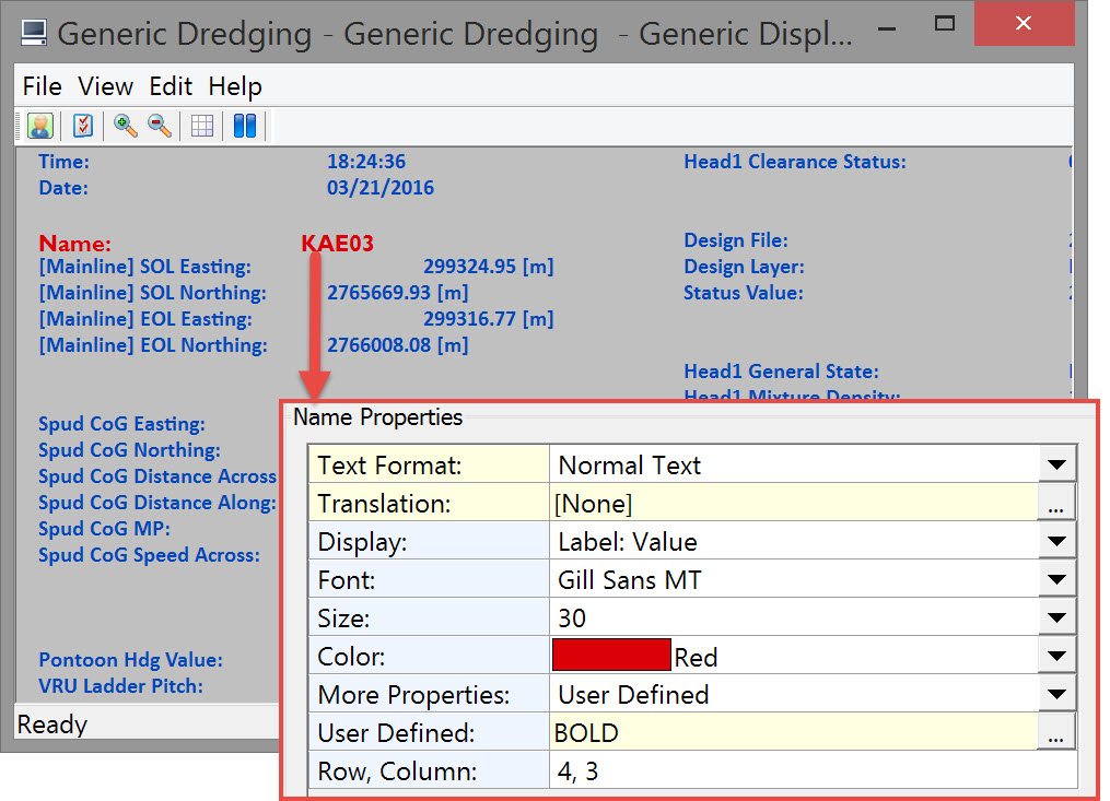 In this next image you see that there is a block under Mainline Name, another under Design File and another under Spud CoG Easting. Of course the idea is to move items around so related data are clustered. For example Line data (name and coordinates) with Spud CoG coordinates, distance across, distance along SOG, COG etc. In order to accomplish this you may have to separate individual items so each can be moved independently. Once an item is isolated from other items it can be moved individually from then on, even when positioned right under another item.