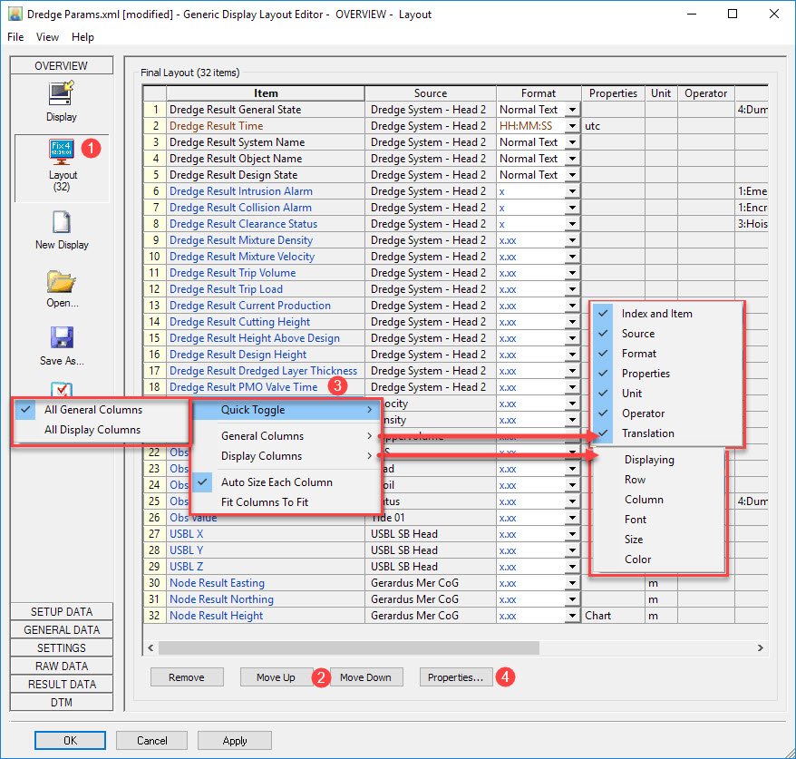 By default only a limited number of columns (General columns) are shown in the layout overview.