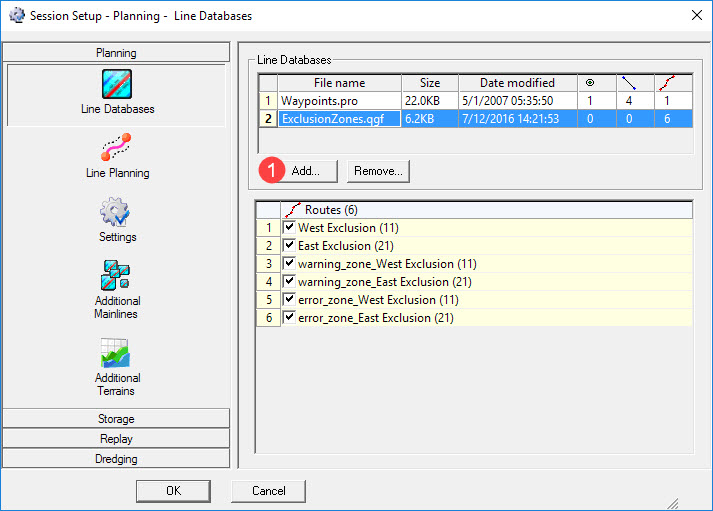 Use this button to add any line database files needed either to run dredging operations and/or for visualization purposes, e.g. dredging exclusion zones.
