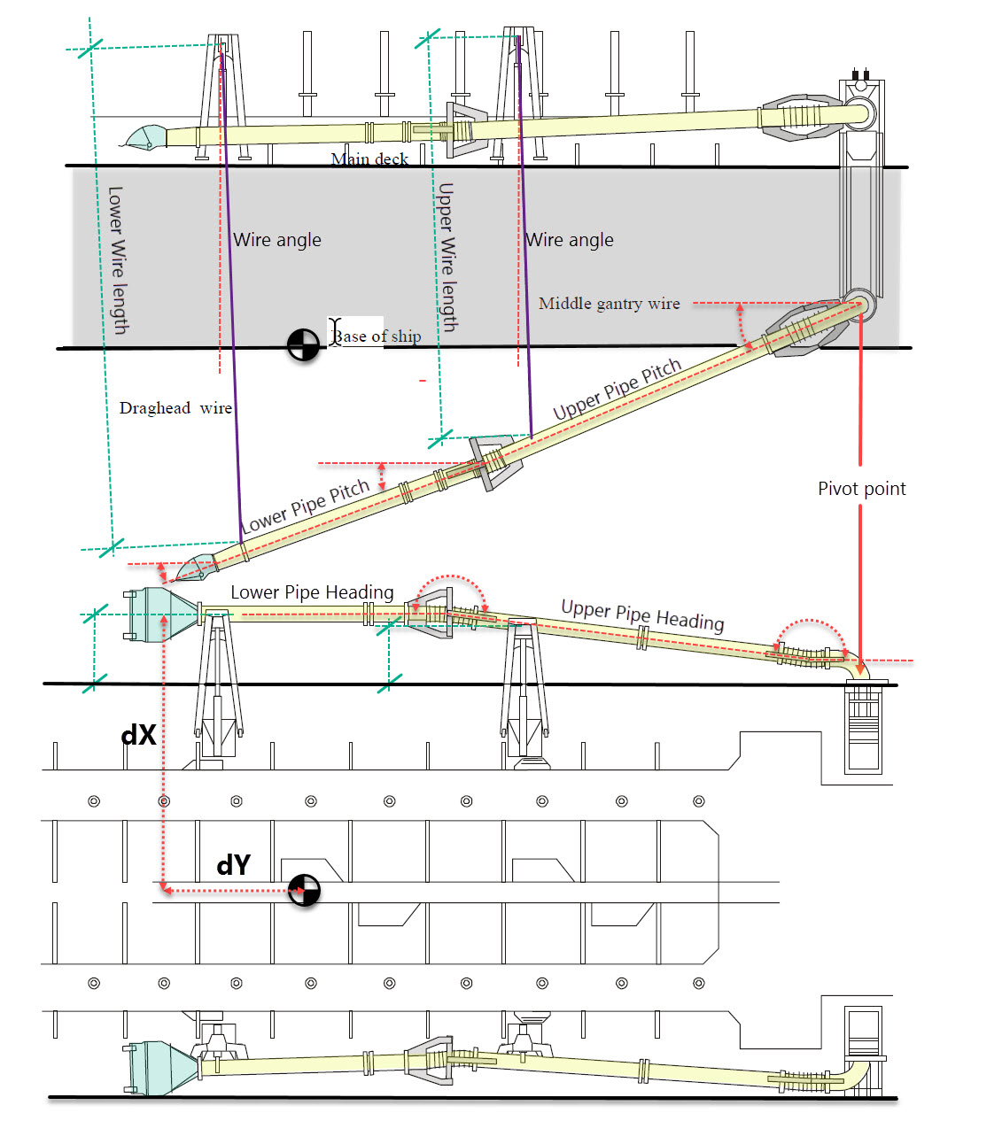 Several different sensor types are used in computing the 3 dimensional dredge head position relative to the ship's reference point, and the position of the TSHD relative to the water surface. Position is determined by angle measurement, horizontally (X, Y) and vertically (Z).
