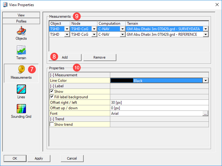 | Show trend | This option shows the trend of a measurement and is typically used during a bundle tow. It show the speed of movement (in survey units) for the bundle. When switched on the following menu items appear : |