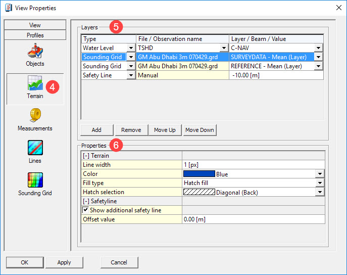 | Show additional safety line | For each selected layer an additional safety line can be added. (Except for Sounding Grid.) Largely unrelated to dredging, this is mainly used during a bundle tow, to indicate a safe depth for the bundle. |