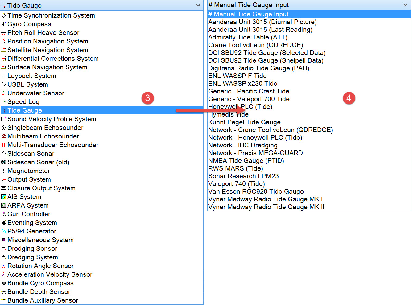 The driver list includes both serial and network drivers. If you have already defined other systems and some of the data messages are sent by the dredger's PLC, it is likely that tide data will also be issued by the PLC.